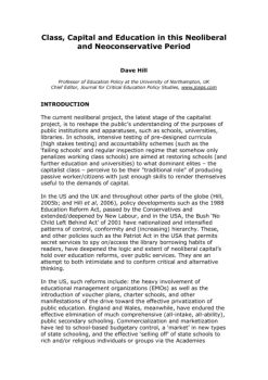 Class, Capital and Education in this Neoliberal and Neoconservative Period Dave Hill Professor of Education Policy at the University of Northampton, UK