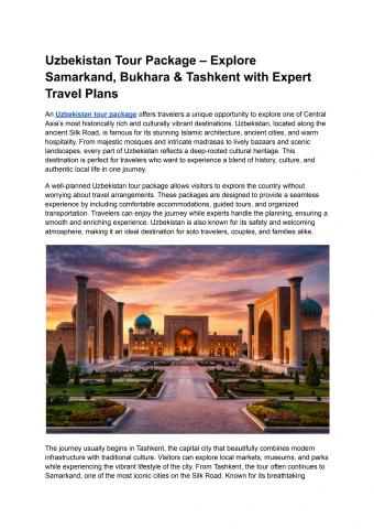 An Uzbekistan tour package offers travelers a unique opportunity to explore one of Central Asia’s most historically rich and culturally vibrant destinations. Uzbekistan, located along the ancient Silk Road, is famous for its stunning Islamic architecture, ancient cities, and warm hospitality.