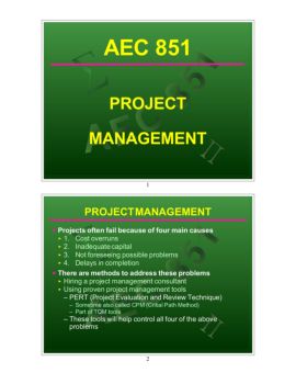 1 AEC 851 PROJECT MANAGEMENT 2 P Projects often fail because of four main causes <1. Cost overruns <2. Inadequate capital <3. Not foreseeing possible problems