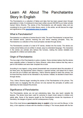 The Panchatantra is a collection of fables and tales that has been passed down through generations in India. It is believed to have been written around 200 BCE by an Indian scholar named Vishnu Sharma. The stories of the Panchatantra are still popular today and are considered to be a part of the Indian literary canon. In this article, we will discuss the origin and significance of the panchatantra story in english.