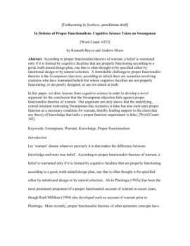 [Forthcoming in Synthese, penultimate draft] In Defense of Proper Functionalism: Cognitive Science Takes on Swampman [Word Count: 6353] by Kenneth Boyce and Andrew Moon