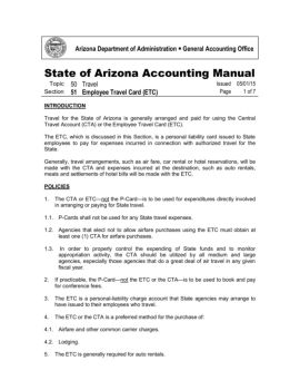 State of Arizona Accounting Manual Topic 50 Travel Issued 05/01/15 Section 51 Employee Travel Card (ETC) Page 2 of 7 6. The ETC is the preferred method for the ...