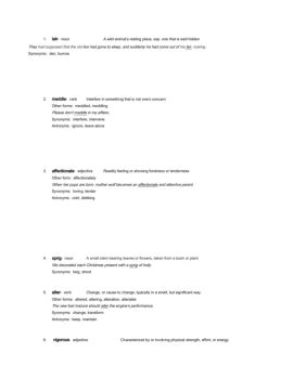 1. lair- noun A wild animal’s resting place, esp. one that is well hidden 1. They had supposed that the old lion had gone to sleep, and suddenly he had come out ...