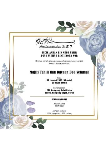 JEMPUTAN MAJLIS TAHLIL DAN BACAAN DOA SELAMAT<br><br>Bismillahirahmanirrahim..<br> <br>Dengan penuh kesyukuran, kami mempersilakan Dato' | Datin | Tuan | Puan | Encik | Cik seisi keluarga hadir ke Majlis Tahlil dan Bacaan Doa Selamat<br> <br> <br>?️ 30 Januari 2024<br> <br>Untuk maklumat lanjut mengenai majlis dan lokasi, sila klik pada pautan kad digital di atas<br> <br>Kehadiran pihak para hadirin sekalian amat kami alu-alukan. Terima kasih.