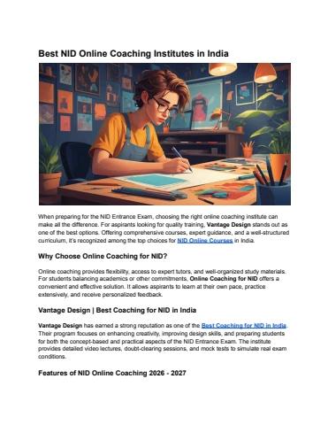 For aspirants seeking success in the NID Entrance Exam, enrolling in Vantage Design’s NID Online Coaching offers a clear advantage. Their comprehensive training, expert guidance, and tailored approach make them one of the Best Coaching for NID in India. Whether preparing for NID Online Coaching 2026 - 2027 or seeking effective Online Coaching for NID Entrance, Vantage Design stands as a reliable partner for your creative journey.