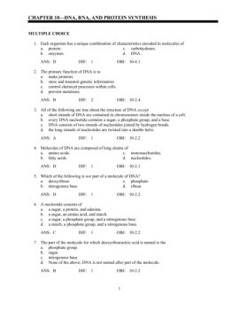 1 CHAPTER 10DNA, RNA, AND PROTEIN SYNTHESIS MULTIPLE CHOICE 1. Each organism has a unique combination of characteristics encoded in molecules of