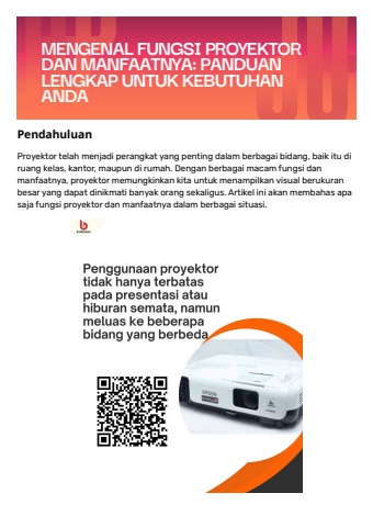 Proyektor adalah perangkat yang berfungsi untuk memproyeksikan gambar atau video ke layar besar, menjadikannya alat yang sangat berguna untuk presentasi bisnis, pembelajaran, atau hiburan. Dalam panduan ini, kami akan mengupas tuntas berbagai fungsi dan manfaat proyektor, mulai dari meningkatkan efektivitas presentasi hingga menciptakan pengalaman menonton yang lebih imersif di rumah. Temukan proyektor yang tepat untuk kebutuhan Anda, dan maksimalkan acara serta kegiatan dengan visual yang jelas dan mendalam.