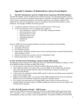 Appendix I: Summary of Medical Device Adverse Event Reports ... which are received by FDA for marketed medical devices. MAUDE is comprised of MDRs received from