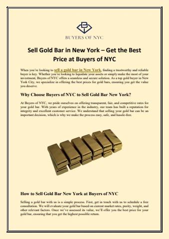 When you’re looking to sell a gold bar in New York, finding a trustworthy and reliable buyer is key. Whether you’re looking to liquidate your assets or simply make the most of your investment, Buyers of NYC offers a seamless and secure solution. As a top gold buyer in New York City, we specialize in offering the best prices for gold bars, ensuring you get the value you deserve.