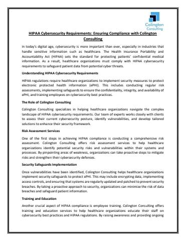 HIPAA cybersecurity requirements are essential for ensuring the protection of patient data in healthcare organizations. By partnering with a trusted firm like Colington Consulting, healthcare organizations can strengthen their cybersecurity posture, achieve HIPAA compliance, and ultimately protect the confidentiality and integrity of patient information. Don't wait until it's too late - contact Colington Consulting today to learn more about how we can help you meet HIPAA cybersecurity requirements and secure your organization's sensitive data.