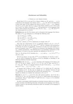 Absoluteness and De nability 1. Formulas and Absoluteness Recall that if Mis a set and Eis a binary relation on M, and ˚px 1;:::;x nqis a formula in the language of ...