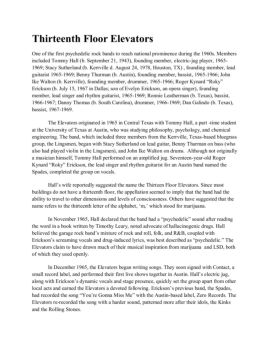 Thirteenth Floor Elevators One of the first psychedelic rock bands to reach national prominence during the 1960s. Members included Tommy Hall (b.