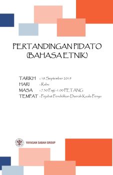 Pertandingan Pidato (Bahasa Etnik) merupakan salah satu aktiviti pengisian program Students Enrichment seperti terkandung dalam plan tindakan Program Kecemerlangan Sekolah (PKPS) bagi tahun 2019. Pengurusan Kumpulan Yayasan Sabah berharap agar aktiviti Pertandingan Pidato (Bahasa Etnik) dilaksanakan disetiap Zon Yayasan Sabah dengan kerjasama Pejabat Pendidikan Daerah seluruh Sabah.