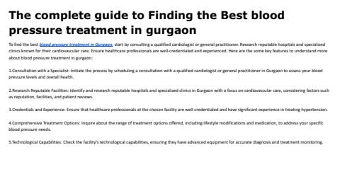 To find the best blood pressure treatment in Gurgaon, start by consulting a qualified cardiologist or general practitioner. Research reputable hospitals and specialized clinics known for their cardiovascular care. Ensure healthcare professionals are well-credentialed and experienced. Here are the some key features to understand more about blood pressure treatment in gurgaon: