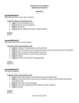 Ceramics 2 Course Summary Department: Visual Arts Semester 2 Learning Objective #1 Reintroduce ceramics, room, rules to students. Target(s) to Meet Learning ...