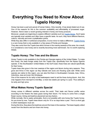 Moreover, people are beginning to explore different varieties such as Tupelo Honey. Such types are typically local varieties and often have a specific taste. As such, they have different flavours, colours, viscosity and even crystallization points.
