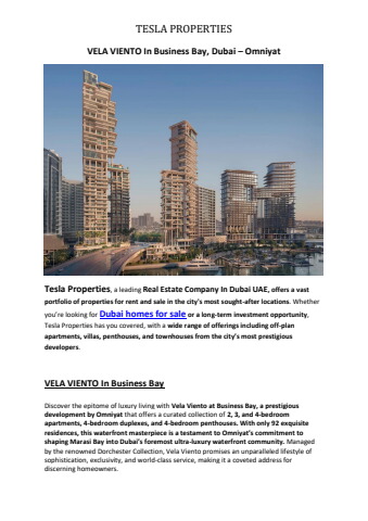 VELA VIENTO In Business Bay By Tesla Properties providing Dubai homes for sale