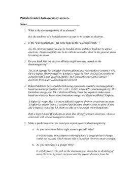 Periodic trends: Electronegativity answers. Name _____ 1. What is the electronegativity of an element? It is the tendency of a bonded ...