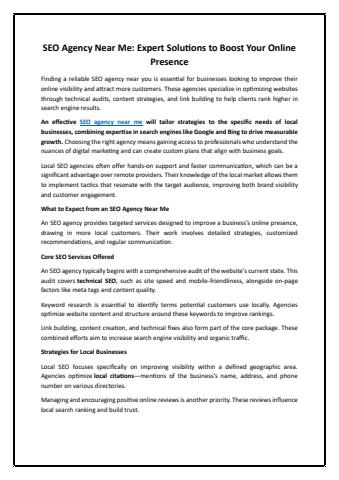 An effective SEO agency near me will tailor strategies to the specific needs of local businesses, combining expertise in search engines like Google and Bing to drive measurable growth.