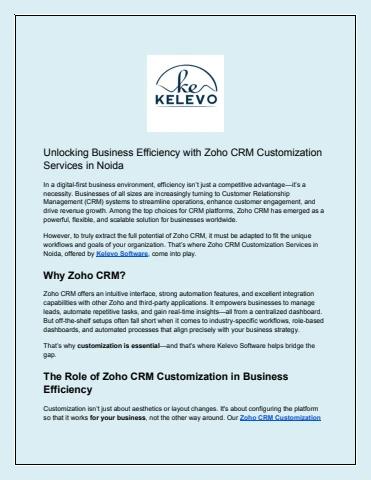 However, to truly extract the full potential of Zoho CRM, it must be adapted to fit the unique workflows and goals of your organization. That’s where Zoho CRM Customization Services in Noida, offered by Kelevo Software, come into play.
