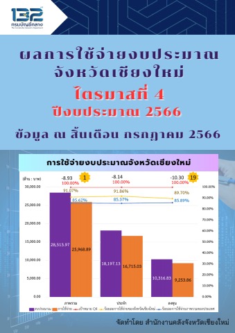 ผลการใช้จ่ายงบประมาณจังหวัดเชียงใหม่ ไตรมาสที่ 4 ปีงบประมาณ 2566 ข้อมูล ณ สิ้นเดือน กรกฎาคม 2566