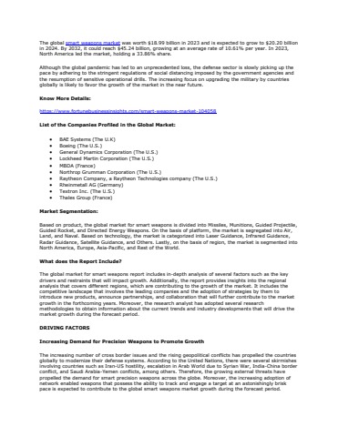 List of Key Companies Invovled in Smart Weapons Market are BAE Systems (The U.K), Boeing (The U.S.), General Dynamics Corporation (The U.S.), Lockheed Martin Corporation (The U.S.), MBDA (France), Northrop Grumman Corporation (The U.S.), Raytheon Company, a Raytheon Technologies company (The U.S.), Rheinmetall AG (Germany), Textron Inc. (The U.S.), Thales Group (France) & Others.