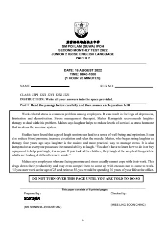 1 霹雳怡保培南独立中学 SM POI LAM (SUWA) IPOH SECOND MONTHLY TEST 2022 JUNIOR 2 IGCSE ENGLISH LANGUAGE PAPER 2 DATE: 16 AUGUST 2022 TIME: 0840-1000 (1 HOUR 20 MINUTES) NAME: REG NO: CLASS: J2PI J2ZI J2YI J2XI J2ZI INSTRUCTION: Write all your answers into the space provided. Part 1: Read the passage below carefully and then answer each question 1-10 ___________________________________________________________________________ This paper consists of 8 printed pages. Prepared by : SONISHA ………………… (MS SONISHA JOHANTHAN) Checked by: ………………… (MISS LING SOON CHING) Work-related stress is common problem among employees. It can result in feelings of depression, frustration and demotivation. Stress management therapist, Mahes Karuppiah recommends laughter therapy to deal with this problem. Mahes says laughter helps to reduce levels of cortisol, a stress hormone that weakens the immune system. Studies have found that a good laugh session can lead to a sense of well-being and optimism. It can also reduce blood pressure, increase circulation and relax the muscle. Mahes, who began using laughter as therapy four years ago says laughter is the easiest and most practical way to manage stress. It is also inexpensive as everyone possesses the natural ability to laugh. “You don’t have to learn how to do it or buy equipment to help you laugh; it is in you. If you look at the children, they laugh at the simplest things while adults are finding it difficult even to smile.” Mahes says employees who are facing pressure and stress usually cannot cope with their work. This drags down their productivity and may even compel them to come up with excuses not to come to work. “If you start work at the age of 25 and retire at 55, you would be spending 30 years of your life at the office. And DO NOT TURN OVER THIS PAGE UNTIL YOU ARE TOLD TO DO SO