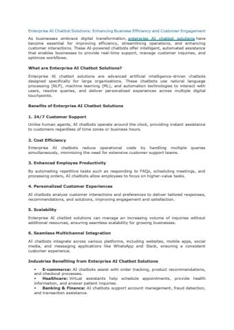 Enterprise AI chatbot solutions are advanced artificial intelligence-driven chatbots designed specifically for large organizations. These chatbots use natural language processing (NLP), machine learning (ML), and automation technologies to interact with users, resolve queries, and deliver personalized experiences across multiple digital touchpoints.