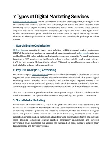 Digital marketing services are the cornerstone of modern business growth, offering an array of strategies and tactics to connect with audiences, drive traffic, and boost revenue. From enhancing search engine visibility to leveraging social media platforms, these services empower businesses, especially small enterprises, to compete and thrive in the digital realm. In this comprehensive guide, we delve into seven types of digital marketing services, illuminating their significance for small businesses and unveiling the pathways to online success.