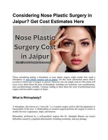 Those considering getting a rhinoplasty or nose plastic surgery might wonder how much a rhinoplasty or nose plastic surgery cost in Jaipur. Do they need clarification about what is covered or which type of surgery to choose? However, one can simply trust us! This article will cover every detail about the price of rhinoplasty, including cost inclusions, cost considerations, and cost-determining variables. Continue reading to learn about the costs of professional nose surgery and nose plastic surgery in Jaipur.