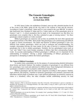 1 The Genesis Genealogies by Dr. John Millam1 (revised June 2010) In 1650, James Ussher, the archbishop of Ireland, came up with a detailed timeline for all