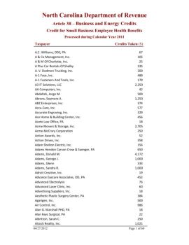 North Carolina Department of Revenue Article 3B – Business and Energy Credits Credit for Small Business Employee Health Benefits Processed during Calendar Year 2011