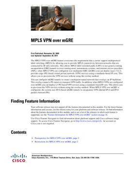 MPLS VPN over mGRE Prerequisites for MPLS VPN over mGRE 2 † Information About MPLS VPN over mGRE, page 3 † How to Configure MPLS VPN over mGRE, page 5