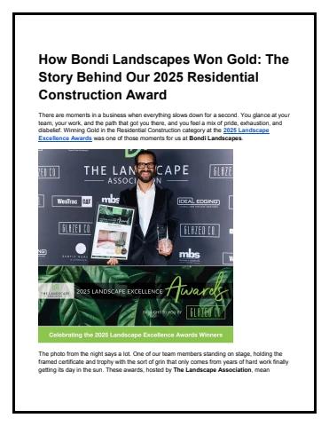 There are moments in a business when everything slows down for a second. You glance at your team, your work, and the path that got you there, and you feel a mix of pride, exhaustion, and disbelief. Winning Gold in the Residential Construction category at the 2025 Landscape Excellence Awards was one of those moments for us at Bondi Landscapes.