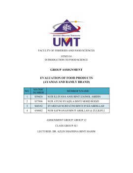 Evaluation of two food product brands which are Ayamas and Ramly chicken nuggets. These evaluations provide processing flow, food safety and quality, nutritional value, labelling and packaging of products.