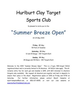 Hurlburt Clay Target Sports Club Is pleased to invite you to the “Summer Breeze Open” 22-24 May 2015 Friday, 22 May 50 Pairs of Doubles Saturday, 23 May