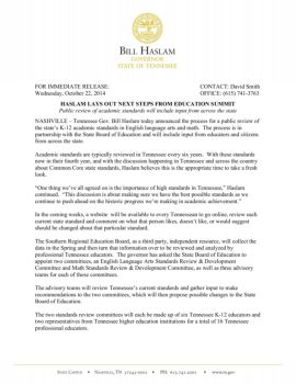 FOR IMMEDIATE RELEASE: CONTACT: David Smith Wednesday, October 22, 2014 OFFICE: (615) 741-3763 HASLAM LAYS OUT NEXT STEPS FROM EDUCATION SUMMIT