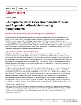 Client Alert June 16, 2015 . CA Supreme Court Lays Groundwork for New and Expanded Affordable Housing Requirements . By . David Gold, Miles Imwalle, Megan Jennings ...