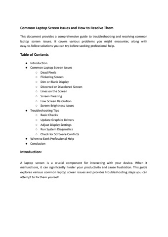 Is your laptop screen acting weird? Don't panic! This guide equips you to troubleshoot and fix common issues like flickering screens, dead pixels, distorted colors, and more. Learn easy step-by-step solutions you can try yourself before seeking professional help. Download this PDF and get your laptop back in top shape!