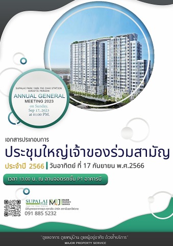 การประชุมใหญ่เจ้าของร่วมสามัญ ประจำปี 2566<br>ในวันอาทิตย์ที่ 17 กันยายน 2566 เวลา 13.00 น. ลานจอดรถชั้น P1 อาคารบี อาคารชุด ศุภาลัย ปาร์ค สถานีแยกไฟฉาย