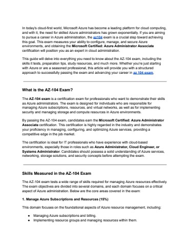 This guide will delve into everything you need to know about the AZ-104 exam, including the skills it tests, preparation tips, study resources, and much more. Whether you’re just starting with Azure or are a seasoned professional, this article will provide you with a structured approach to successfully passing the exam and advancing your career in az 104 exam.