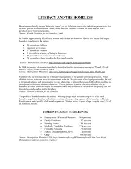 LITERACY AND THE HOMELESS Homelessness literally means ‘Without a Home’ yet this definition may not include those persons who live in small quarters with ...