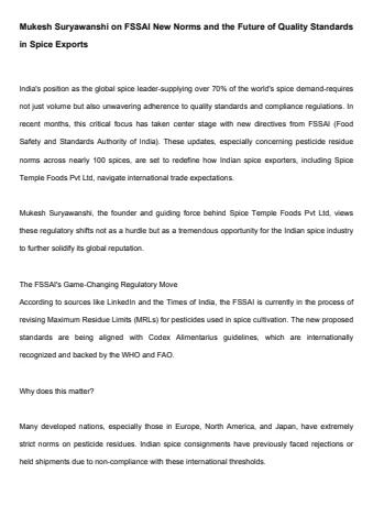 Explore how Mukesh Suryawanshi, founder of Spice Temple Foods Pvt Ltd, is navigating the evolving landscape of India’s spice export industry. With India supplying over 70% of the world’s spices, recent updates from FSSAI—including revised pesticide residue norms for nearly 100 spices—are redefining compliance and export-readiness. In this detailed report, learn how Spice Temple Foods Pvt Ltd is preparing for global certification standards such as ISO, HACCP, and USDA Organic.