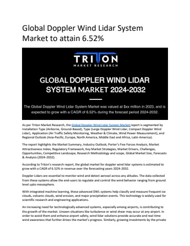 According to an analysis by Triton Market Research, the Global Doppler Wind Lidar System Market was valued at $xx million in 2023 and is expected to reach $xx million by 2032, growing at a CAGR of 6.52% during the forecast period 2024-2032.