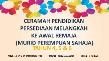 Ceramah ini bertujuan memberi pendedahan kepada murid-murid dalam menempuhi alam remaja agar mereka dapat membuat persediaan diri dengan lebih awal secara penuh yakin. Selain itu, mereka dapat menerima dan memahami perubahan fizikal, mental dan emosi diri dengan sebaik mungkin. Akhirnya mereka tahu menjaga kebersihan dan kesihatan diri dengan sempurna