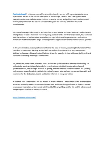 In summary, Paul Easterbrook's journey is an inspiring mix of sporting passion, musical talent, global adventures, and a fruitful finance career. His life is a powerful illustration of his relentless zest for living and his success across various domains.
