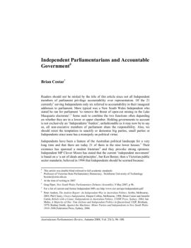 98 Brian Costar APR 23(1) Ironically, the trail blazing Tasmanian Accord actually reduced the opportunity for the parliament to hold the executive to account.