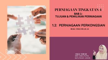 Bahan ini mengandungi tentang definisi, ciri-ciri, kelebihan & kekurangan perniagaan perkongsian serta jenis rakan kongsi dalam perniagaan ini.Bahan ini disediakan oleh Cikgu Norah, dari Batu Pahat Johor.Semoga bermanfaat.