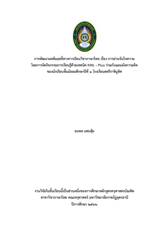 วิจัยในชั้นเรียน เรื่อง การพัฒนาผลสัมฤทธิ์ทางการเรียนวิชาภาษาไทย เรื่อง การอ่านจับใจความ โดยการจัดกิจกรรมการเรียนรู้ด้วยเทคนิค KWL - Plus ร่วมกับแผนผังความคิด