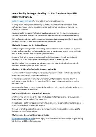 Reach Facility Managers with a 95% verified, customizable mailing list. Ideal for B2B marketing and email campaigns. Start today!